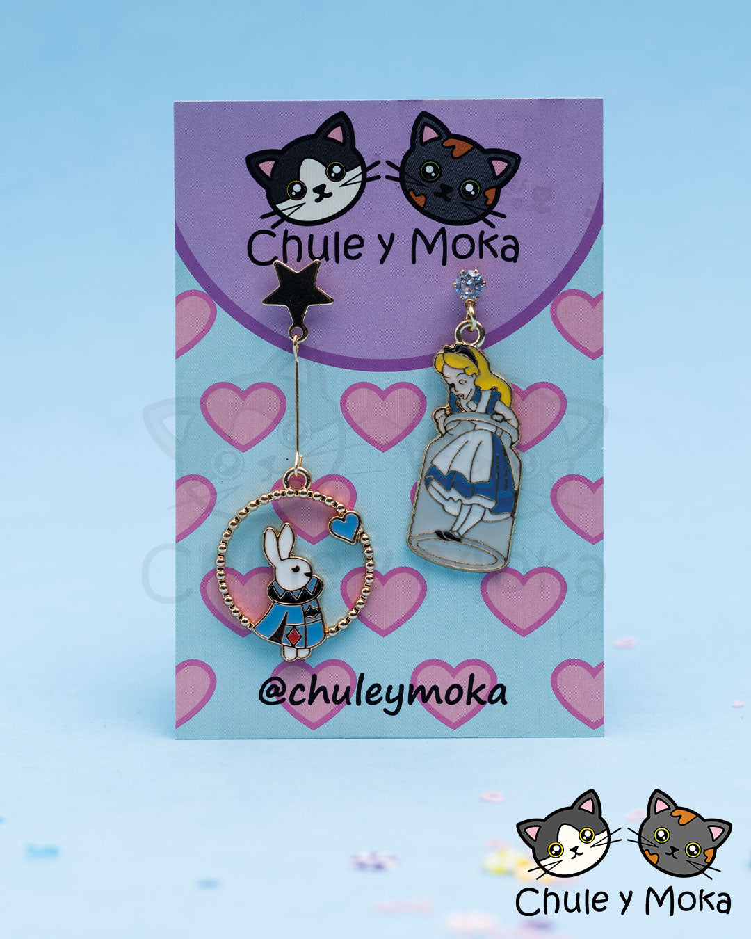 Aretitos preciosos con forma de Alicia y conejo, hechos de Plata con Barniz.